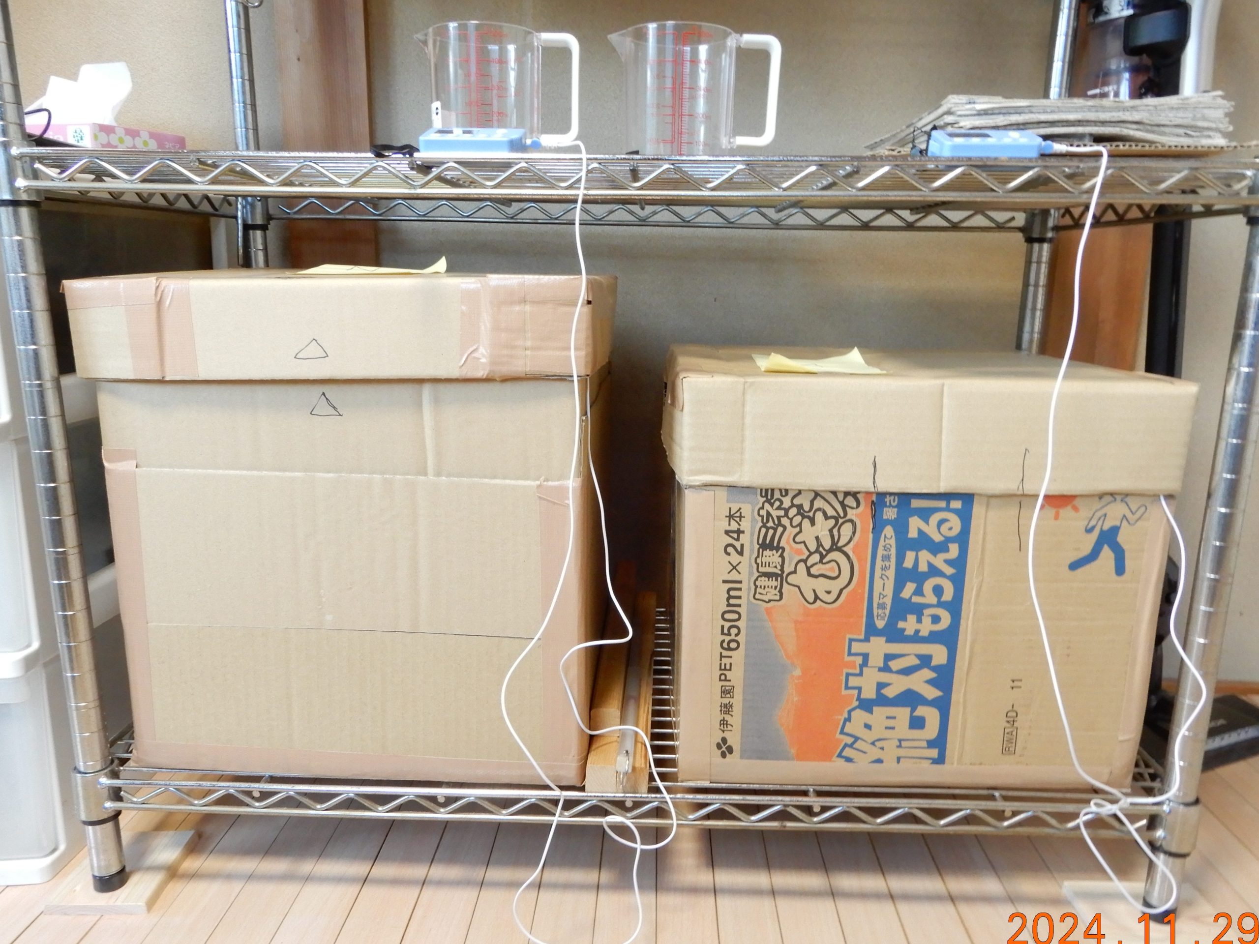 生ごみが分解すると水分が発生します。この水分はいったんダンボールに吸収されたあとダンボールの外側の面から空気中に放出されていきます。箱を床に直置きすると箱の底板部分に水分がたまり、底板を傷め、床を濡らすことになります。ダンボール箱は底を浮かし、風通しの良い台の上に置くようにします。私は通常置いておくのはスチールの棚(後述)に、作業でとりだすときは木の角材の上に置くようにしています。
