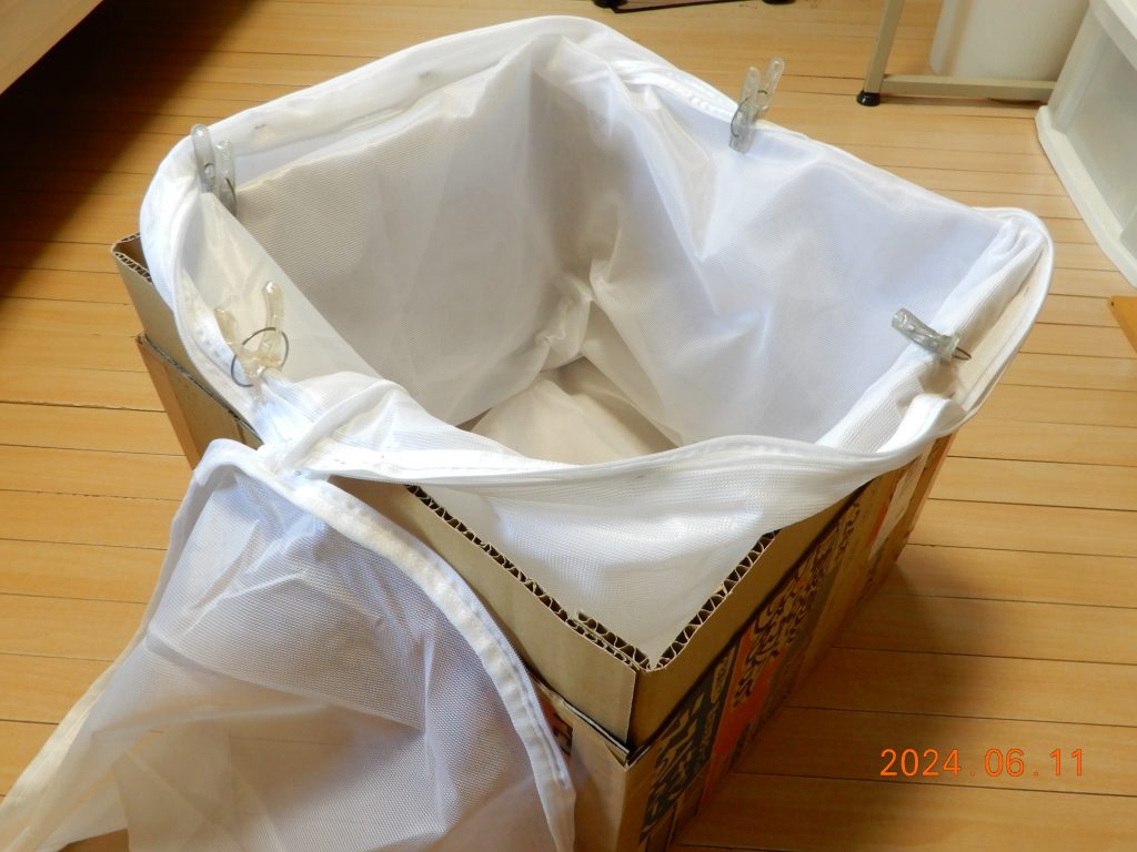 ダンボール箱の中に洗濯ネット(円柱型直径約45㎝、高さ40㎝)を納め、洗濯ネットの中に母材を入れます。洗濯ネットは一枚だと母材がかなり漏れるため、二重にします。内側のネットの蓋は取り外し、一枚だけにします。蓋があるので虫の侵入を防ぐことができます。