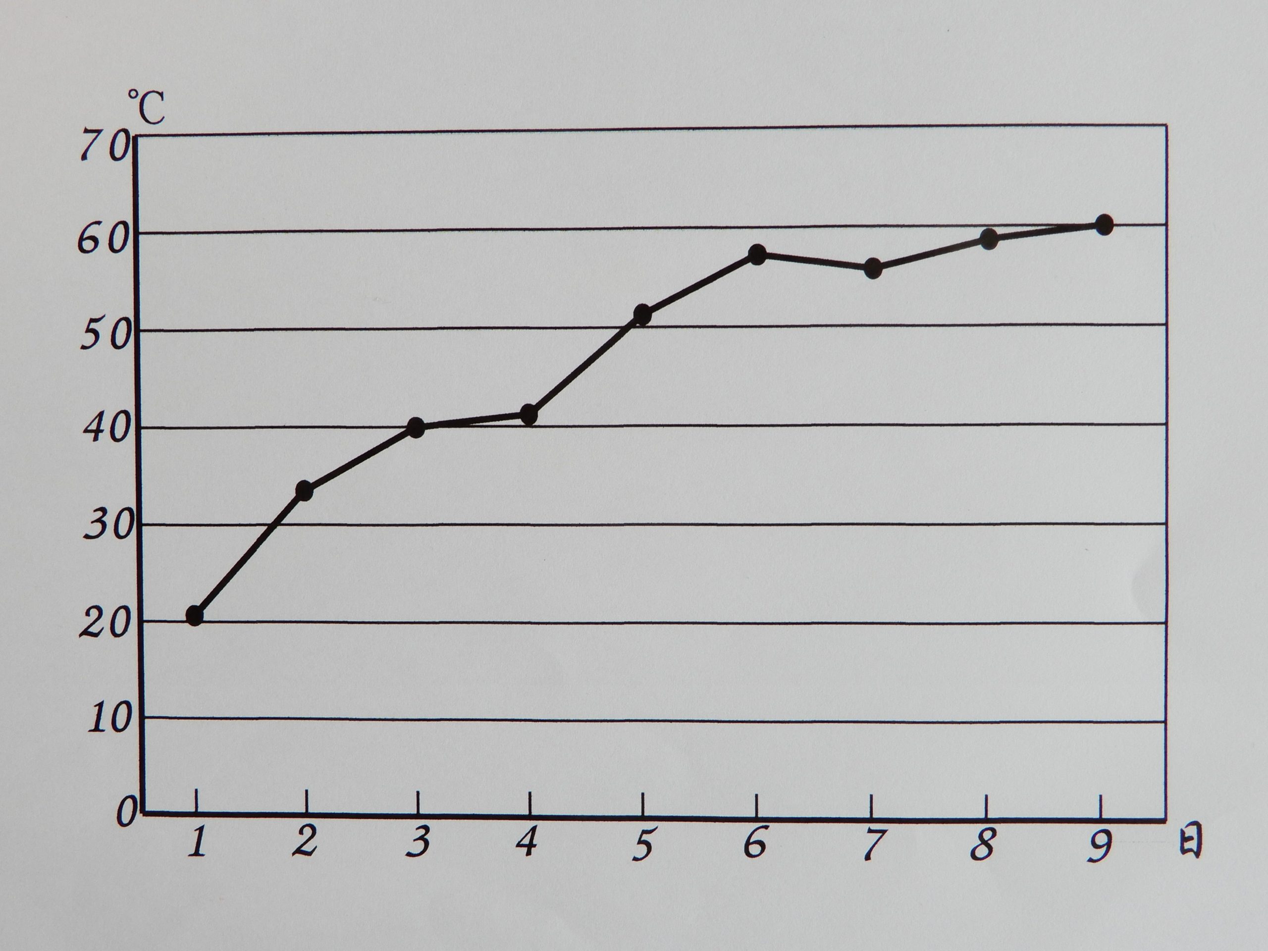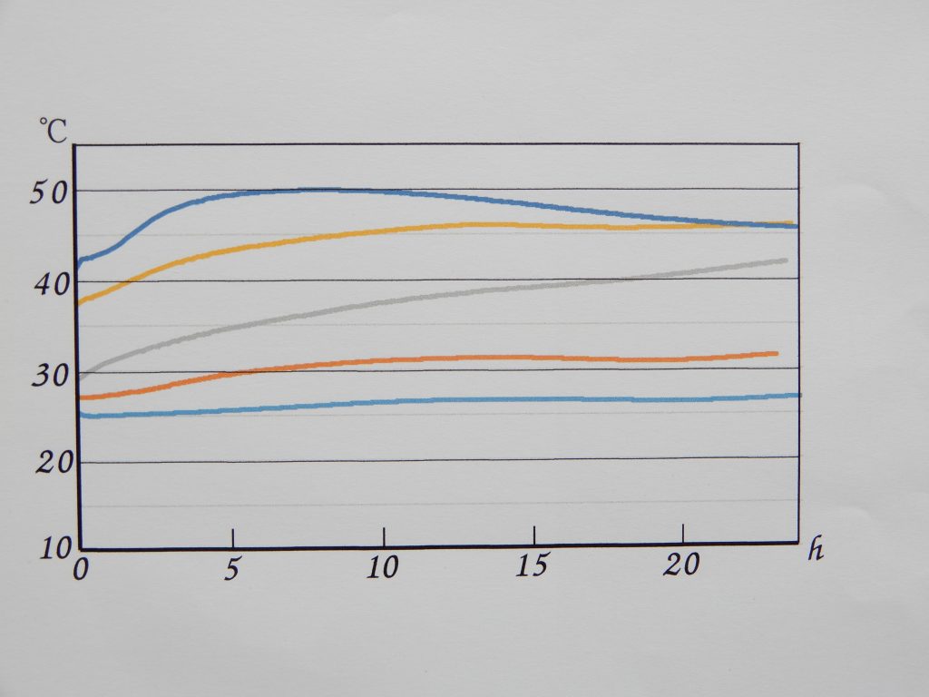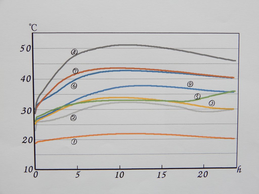 このグラフには8本の温度曲線が示されています。本来は一番下の線①の下にさらに3本の線があるのですが煩雑になるので省略しています。それらの温度曲線は①と同じで18℃から始まって20℃に届くかどうかという状態で、これから温度がどんどん上がっていくだろうとは期待できません。母材の温度が20℃そこそこでは微生物や菌は活発には活動できないということを実地で教えられました。なにか別の方法で母材の温度を上げる必要があります。