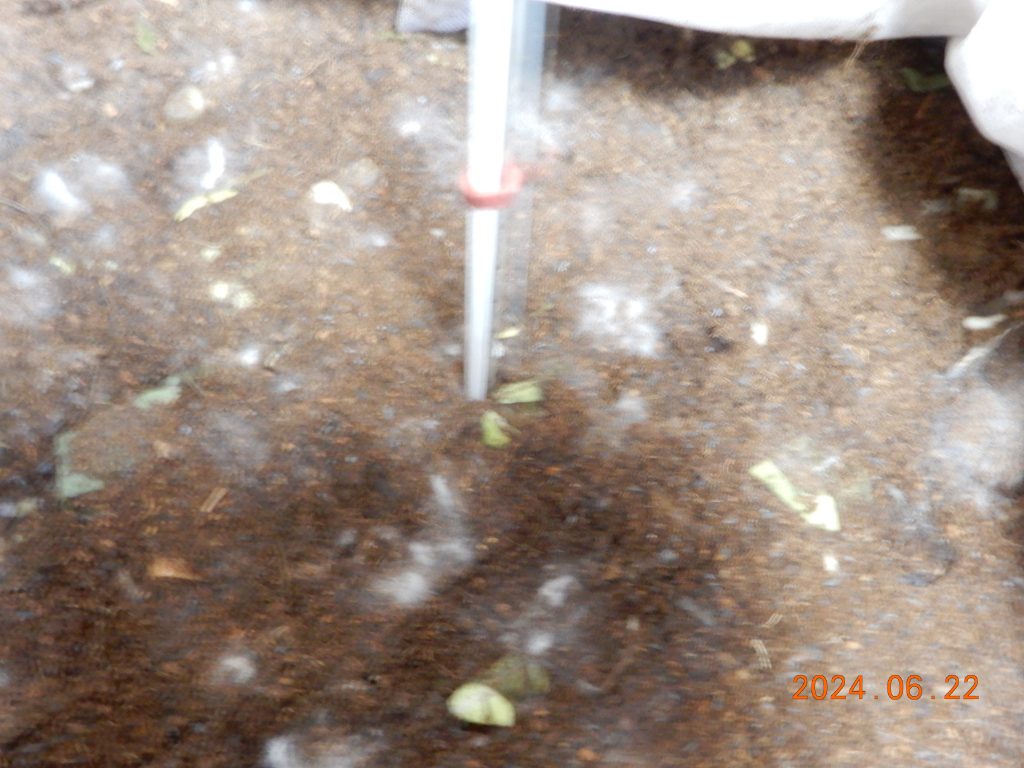 一日目の母材は出発時点で20℃以下でしたが堆肥を加えた効果で何とかなるかと思いましたが、やはり20℃以下ではいくら堆肥を入れていても微生物は動かないということを確認しただけでした。二日目は先の寒冷期の例を生かして、温水を入れたPETボトルを箱の四隅に入れました。生ごみの分解が始まり母材は30℃を越えました。その後五日目までは温水PETボトルを入れています。五日目に最高温度は50℃を越えてきました。六日目はPETボトルなしで57℃になりました。以降はもはや通常の生ごみ投入のやり方で順調に進むようになります。この過程で五日目には糸状菌の発生も確認できています。